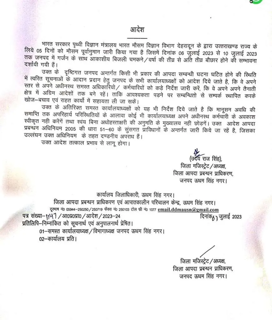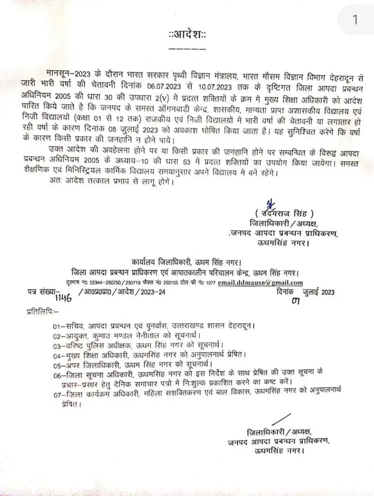 उत्तराखंड में मानसून में एकाएक बढ़ोतरी होने के चलते भारत सरकार पृथ्वी विज्ञान मंत्रालय मौसम विज्ञान केंद्र के द्वारा जारी भारी वर्षा की चेतावनी के बाद एक बार फिर उधम सिंह नगर जनपद में जिला अधिकारी जनपद आपदा प्रबंधन प्राधिकरण के अध्यक्ष उदय राज सिंह ने 8 जुलाई को भी अवकाश घोषित किया है जारी आदेश के अनुसार उन्होंने मुख्य शिक्षा अधिकारी को आदेश देते हुए कहा कि जनपद के समस्त आंगनबाड़ी केंद्र शासकीय मान्यता प्राप्त अशासकीय विद्यालय