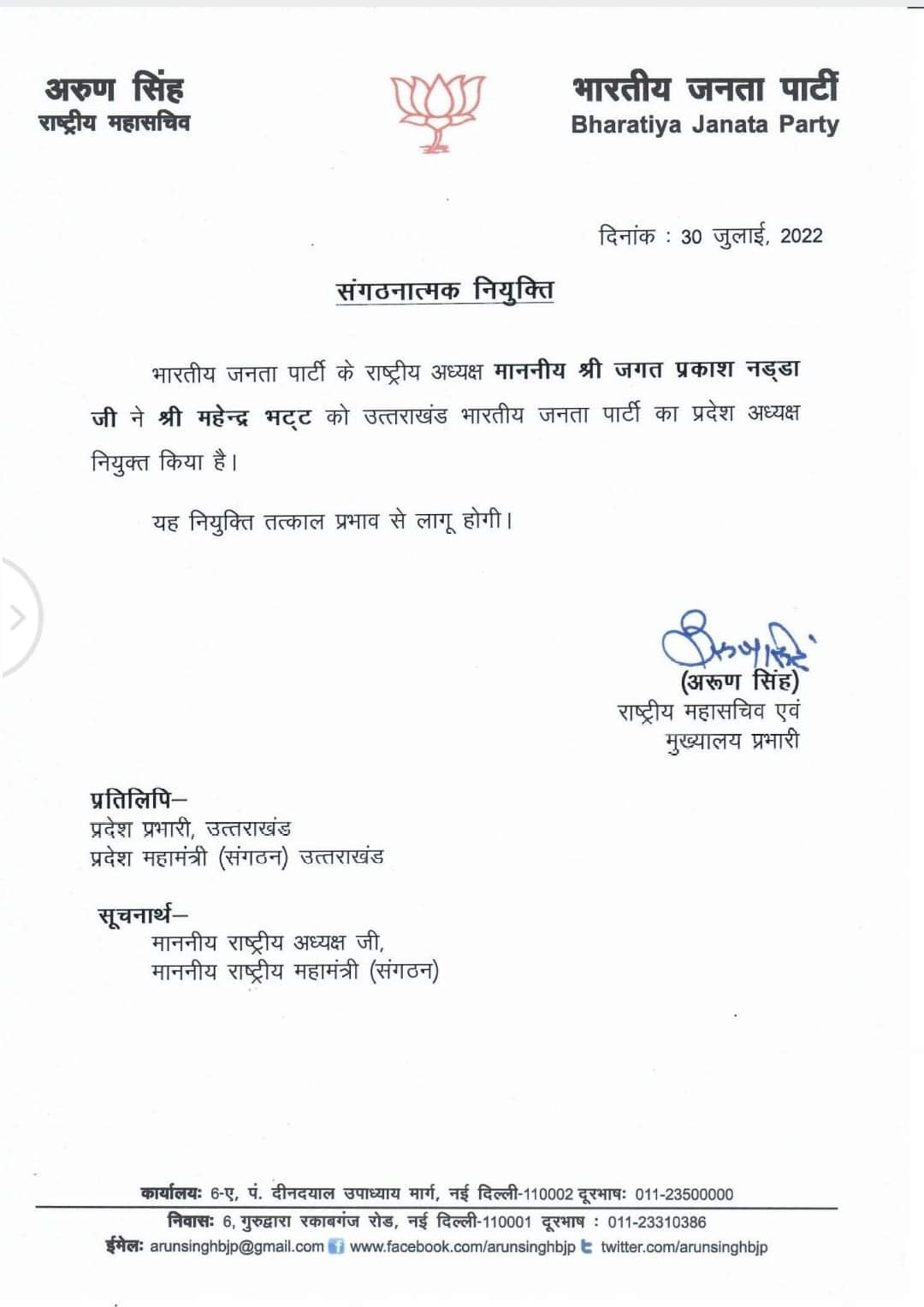 उत्तराखंड देहरादून से बड़ी खबर बीजेपी ने प्रदेश नेतृत्व मैं बदलाव कर मदन कौशिक को हटाकर नए प्रदेश अध्यक्ष महेश भट्ट जी को सौंप दी है अब बीजेपी के नए प्रदेश अध्यक्ष महेश भट्ट जी होंगे राष्ट्रीय अध्यक्ष जेपी नड्डा की संस्तुति का पत्र जारी हो गया है